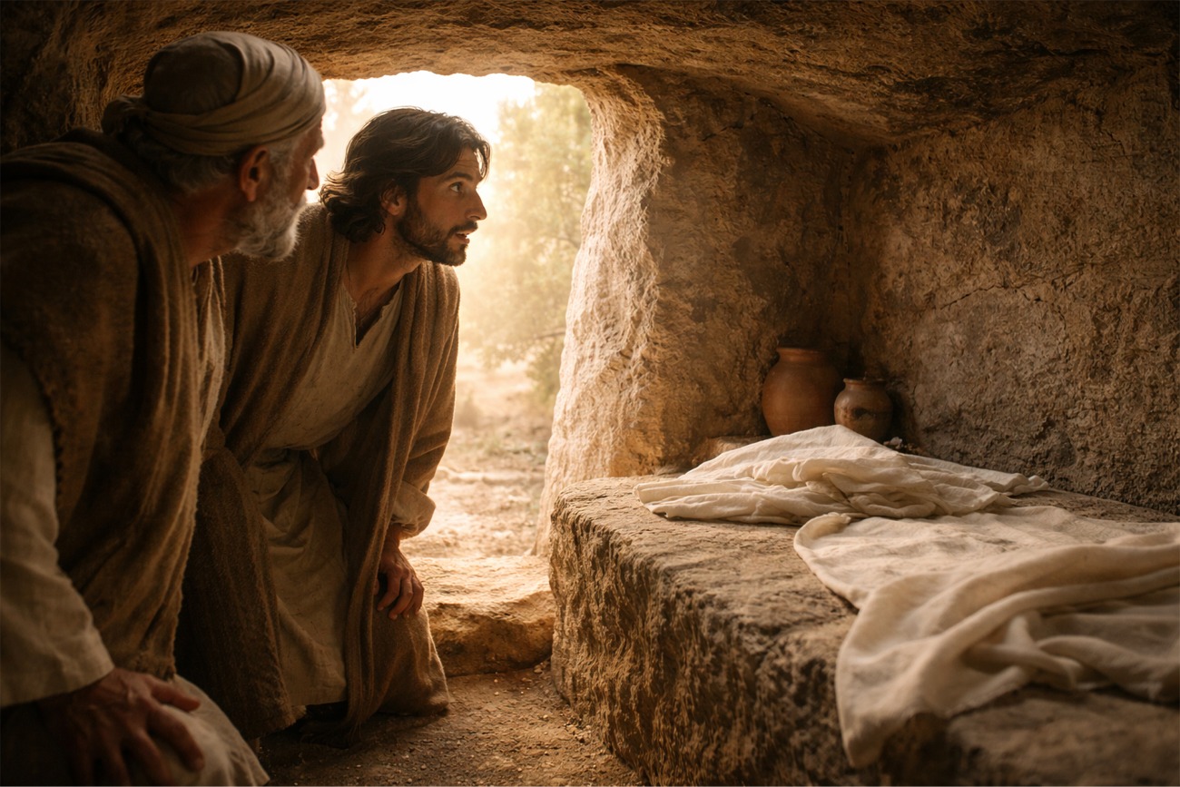Este pasaje no es un final triunfal; es un comienzo discreto. La fe aquí empieza a germinar, todavía frágil, todavía abierta. Así es también nuestra fe diaria: se construye en gestos pequeños, en decisiones honestas, en una esperanza que no hace ruido. El sepulcro vacío nos recuerda que Dios suele adelantarse, y que nuestra tarea no es controlarlo todo, sino dejarnos sorprender y seguir caminando.