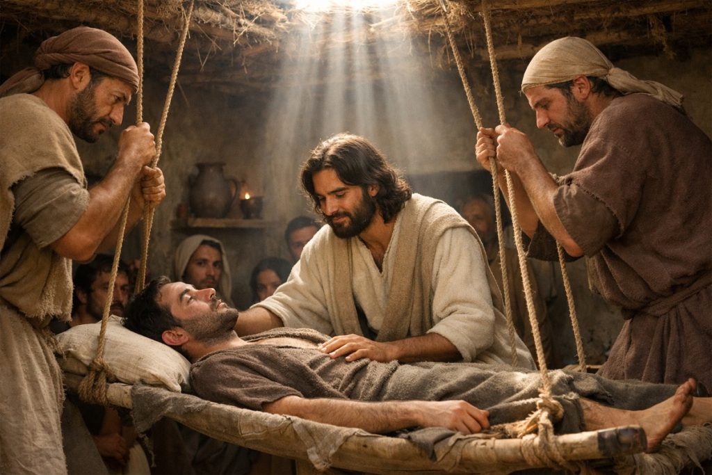 Lectura del santo evangelio según san Marcos (2,1-12): Cuando a los pocos días volvió Jesús a Cafarnaún, se supo que estaba en casa. Acudieron tantos que no quedaba sitio ni a la puerta. Él les proponía la palabra. Llegaron cuatro llevando un paralítico y, como no podían meterlo por el gentío, levantaron unas tejas encima…